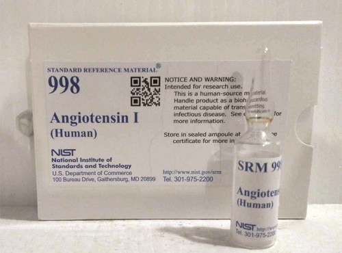 SRM 998 血管緊張素 I主要用于腎素測定的校準(zhǔn)和標(biāo)準(zhǔn)化,并用作氨基酸分析和高效液相色譜 (HPLC) 的參考肽。一個單位的 NIST SRM 998 由 0.5 mg 化學(xué)合成的血管緊張素 I 組成。