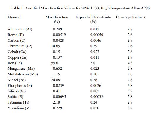 被測量是 SRM 1230 中每種成分的認(rèn)證值。認(rèn)證值在表 1 中提供,并以質(zhì)量分?jǐn)?shù)報告 [1]。隨數(shù)值列出的不確定度是擴(kuò)展不確定度,U = kuc,基于 95% 置信水平 [2],根據(jù) ISO/JCGM 指南 [3] 中的方法計算。 NIST 認(rèn)證值是 NIST 對其準(zhǔn)確性具有最高置信度的值,因為所有已知或可疑的偏差來源都已被調(diào)查或考慮 [4]。認(rèn)證值是根據(jù) NIST 和合作實驗室進(jìn)行的分析結(jié)果對“真實”值的當(dāng)前最佳估計。用于確定成分的測試方法在附錄 A 和隨附的關(guān)鍵字中確定。計量溯源性是導(dǎo)出的 SI 單位的質(zhì)量分?jǐn)?shù)(以百分比表示)。