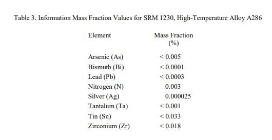 表 3 中提供了其他成分的信息值。信息值被認(rèn)為是 SRM 用戶感興趣的值,但沒有足夠的信息來評估與該值相關(guān)的不確定性。它們旨在提供有關(guān)矩陣的附加信息。