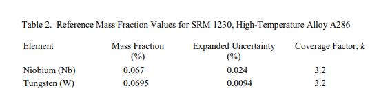 被測量是表 2 中提供的鈮和鎢的參考值,通過規(guī)定的方法確定。參考值在表 2 中給出。參考值是非認(rèn)證值,是當(dāng)前對真實值的最佳估計;但是,這些值不符合 NIST 的認(rèn)證標(biāo)準(zhǔn),并且提供了相關(guān)的不確定性,可能不包括不確定性的所有組成部分 [4]。隨數(shù)值列出的不確定度是基于 95% 置信水平 [4] 的擴(kuò)展不確定度,根據(jù) ISO/JCGM 指南 [3] 中的方法計算。計量溯源性是導(dǎo)出的 SI 單位的質(zhì)量分?jǐn)?shù)(以百分比表示)。