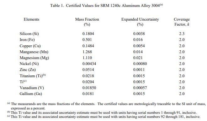 NIST SRM  1240c 鋁合金3004 (標準品) 的認證在規定的測量不確定度內無限期有效,前提是按照本證書中的說明處理和存儲 SRM(參見“使用說明”)。因此,不需要定期重新認證此 SRM。該認證將是如果 SRM 被損壞、污染或以其他方式修改,則無效。