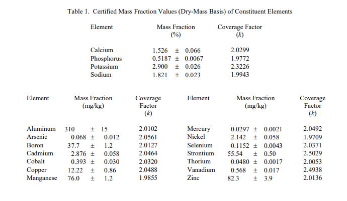 表 1 中提供了以干質量為基礎報告的選定組成元素的認證質量分數值。NIST 認證值是 NIST 對其準確性有最高置信度的值,在所有已知或已調查或考慮了可疑的偏見來源帳戶 [1]。