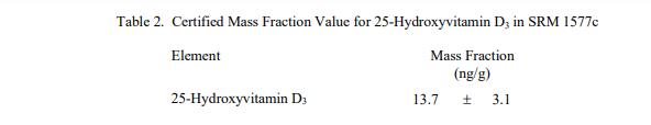 表 1 中提供了元素的認證質量分數值。表 2 中提供了 25-羥基維生素. D3 的認證質量分數值。元素的認證值基于所執行的主要分析技術的結果在 NIST 或在 NIST 和合作專家實驗室獲得的兩種或多種化學獨立分析技術的組合結果 [1]。 25-羥基維生素 .D3 的認證值基于 NIST 和合作專家實驗室的綜合結果。 NIST 認證值是 NIST 對其準確性具有最高置信度的值,因為所有已知或可疑的偏差來源都已被調查或考慮在內 [1]。