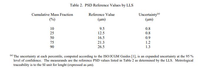 NIST SRM 1985 碳化鎢/鈷(標準品)LLS 的參考 PSD 值列在表 2 中。參考值是未經認證的值,是對真實值的估計。但是,這些值不符合 NIST 認證標準,并且提供了相關的不確定性,可能僅反映測量精度,可能不包括所有來源不確定性,或可能反映多種分析方法之間缺乏足夠的統計一致性 [1]。