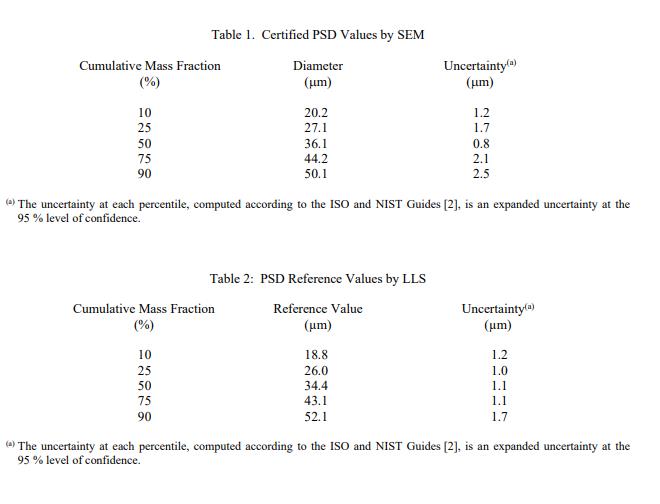 經 SEM 認證的 PSD 值列于表 1。這些認證值是通過測量來自三個瓶子的 11 000 多個單個顆粒而確定的。 NIST 認證值是 NIST 對其準確性具有最高置信度的值,因為所有已知或可疑的偏差來源都已被調查或考慮在內 [1]。