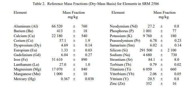 表 1 中提供了四種對環境重要的元素的認證質量分數值。NIST 認證值是 NIST 對其準確性有最高置信度的值,因為所有已知或可疑的偏差來源都已調查或由 NIST [2] 解釋。被測量是表 1 中元素的認證質量分數,在計量上可追溯到 SI 質量分數單位以毫克每公斤表示。