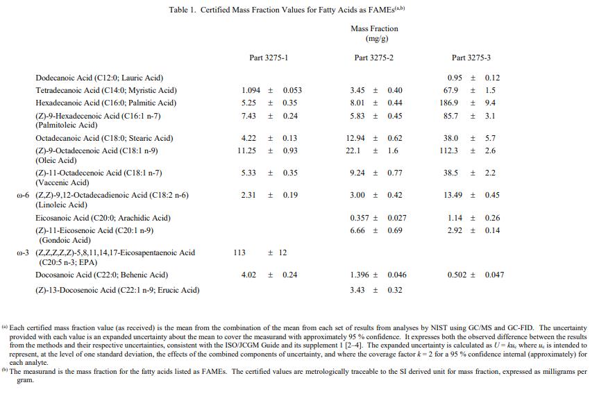 表 1 中提供了脂肪酸的認(rèn)證質(zhì)量分?jǐn)?shù)值。NIST 認(rèn)證值是 NIST 對其準(zhǔn)確性有最高置信度的值,因?yàn)樗幸阎蚩梢傻钠顏碓炊家驯徽{(diào)查或采用考慮[1]。 NIST 使用兩種獨(dú)立的方法對賦值進(jìn)行了分析。所有認(rèn)證值均計(jì)算為每個(gè)平均值的平均值方法。相關(guān)的不確定性以 95% 的置信水平表示 [2-4]。值以質(zhì)量分?jǐn)?shù)單位 [5] 以收到的形式報(bào)告。